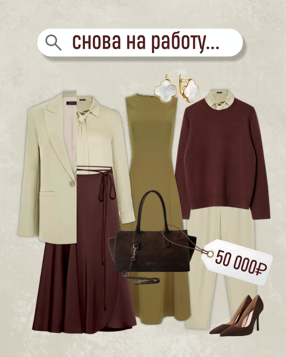 «С Нового года выхожу на работу, сразу после каникул. Надеть нечего: дресс-кода не было у меня никогда. Я в панике. Как люди на работу ходят?» ⠀ Не вписаться на работе – очень неприятно. Не так зашла, не так улыбнулась, не так оделась – нарушила нечто негласное. И вот ты не то чтобы изгой (мы все вежливые и вообще профессионалы), но как-то так. Другим по мелочи помогают, тебе нет. Других зовут после работы – тебя нет. Неприятно. ⠀ Правильная одежда не гарантирует, что вас примут. Она просто дает опору. Опора дает уверенность. А уверенность – обаяние🫶🏻 ⠀ Мы собрали нейтральный гардероб с характером. Да, так бывает. ⠀ Взяли нейтральные цвета, гладкие фактуры и спокойный крой. И добавили один простой контраст: светлое VS. темное. Характер – от контраста. Нейтральность – во всем остальном. ⠀ Темное и светлое – самый безопасный контраст, если это не черно-белый. Черно-белый тоже хорош, но затаскан до банальности, что с ним нужно что-то эдакое придумывать. ⠀ А мы взяли светло оливковы