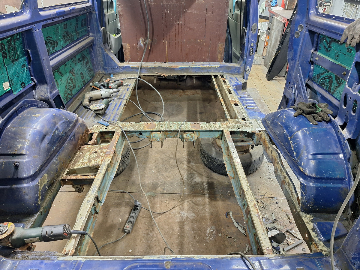 Работа с машиной маленькими шагами, но двигалась постепенно, еще с лета. Первоочередная задача - вырезать гнилье, максимально разобрать кузов для очистки под ремонт. После плоскости пола в заднем отсеке ампутировал короба - упоры для пружин подвески. Многослойная конструкция сильно прогнила, проще изготовить заново, чем вычищать и кроить заплатки. Предварительно, конечно, засек расположение относительно других элементов. Часть пола за водительским сиденьем выглядела вполне прилично. Но мы то знаем... Накладка центральной (основной) поперечины между лонжеронами - тоже отлетела, слишком заманчиво выглядывала ржавчина изнутри. Верхняя часть порога хлопушки - казалось бы, вполне годная - а вот нет. Порог под сдвижной дверью - до меня уже меняли. А лучше б не трогали.. Заднее крыло обрезаю по максимуму - много жуков, кромка напрочь гнилая. Да, можно было пониже пилить - но я хочу, чтобы сварной шов был как можно дальше от колеса, и максимально доступен для обработки с внутренней сторо