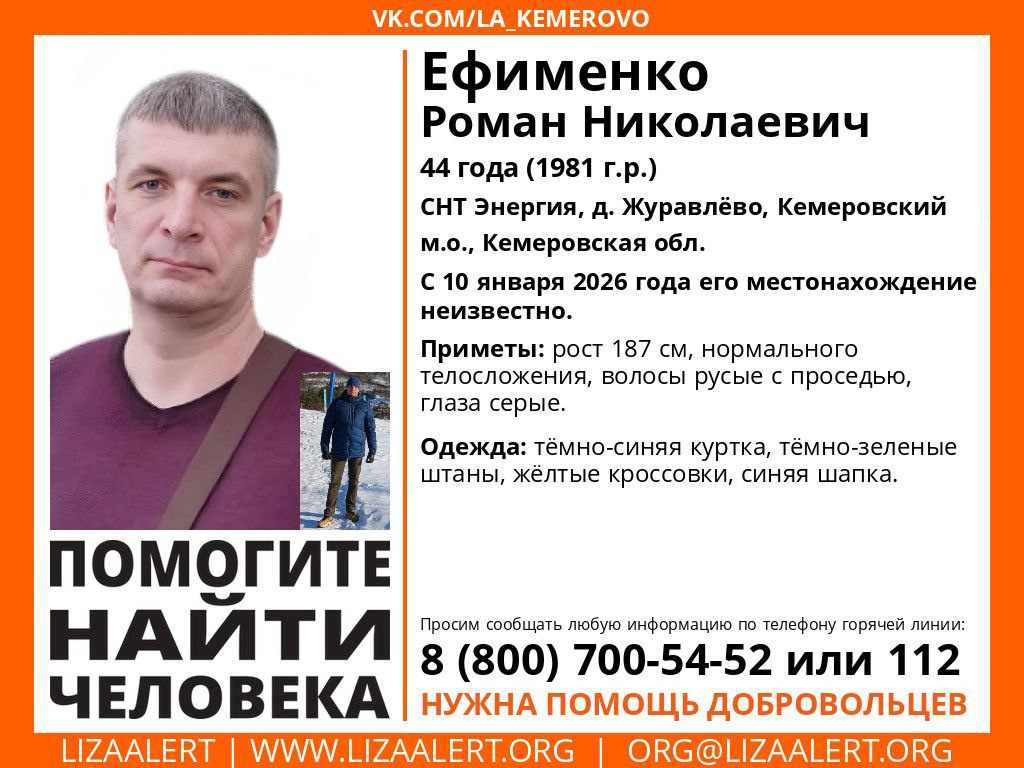 Недалеко от Кемерова исчез при загадочных обстоятельствах мужчина средних лет. Поисковики проверяют камеры. В Кемеровском округе пропал 44-летний Роман Ефименко, сообщает во вторник, 13 января, поисковый отряд "ЛизаАлерт". – 10 января в 13:00 мужчина направился в СНТ Энергия и с тех пор его местонахождение неизвестно, – сказано в ориентировке. Приметы: рост 187 сантиметров, нормальное телосложение, русые с проседью волосы, серые глаза. Был одет в тёмно-синюю куртку, тёмно-зеленые штаны, жёлтые кроссовки и синюю шапку. Волонтёры отмечают, что в Энергии много уличных видеокамер, и просят местных жителей проверить записи. Возможно, так получится разгадать загадку таинственного исчезновения мужчины. Также пропавшего могли видеть автомобилисты по пути к посёлку Журавлёво. Передать данные можно по номеру 8-800-700-54-52.