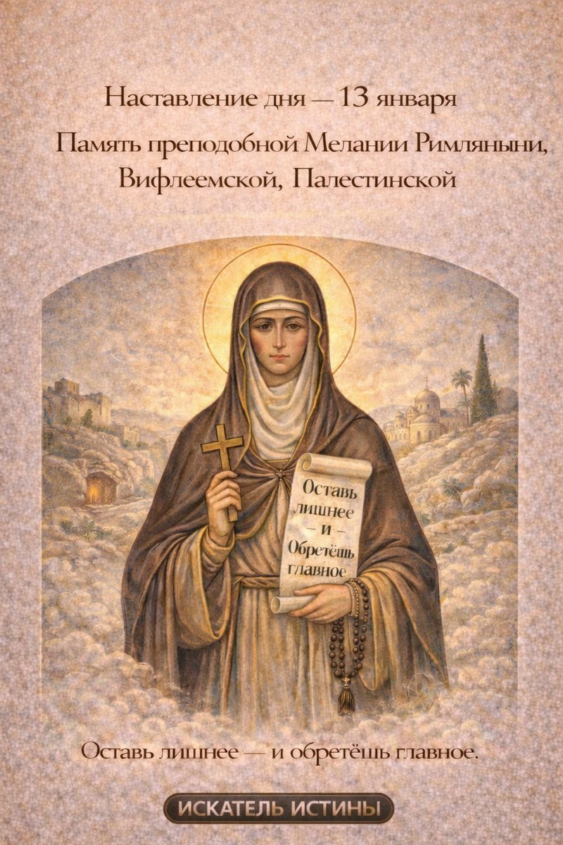Память преподобной Мелании Римлянки, Вифлеемской, Палестинской Преподобная Мелания, оставив богатство, знатность и земную славу, избрала путь смирения, молитвы и полного упования на Бога. Она показала, что истинная свобода рождается не во внешнем достатке, а в отречении от всего, что мешает душе быть с Господом. Её жизнь напоминает нам: когда сердце ищет Бога искренне, никакие жертвы не бывают напрасными, и каждый шаг по пути смирения становится шагом к вечной радости. Пусть и твой день будет наполнен внутренней тишиной, смирением и решимостью следовать за Христом.