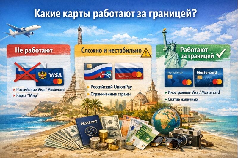 Если при поездках за границу вам важна максимальная предсказуемость и отсутствие сюрпризов, оптимальным решением остаётся карта иностранного банка Visa или Mastercard, оформленная за пределами России.
