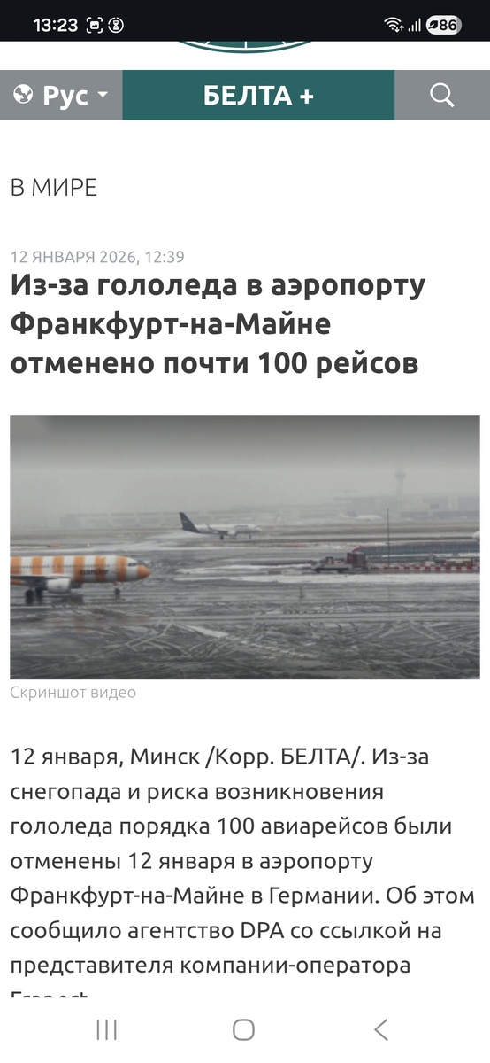 Сообщаю: нам конкретно повезло! Из-за гололеда вчера в аэропорту Франкфурта-на- Майне было отменено 98 утренних рейсов, а наш самолёт должен был вылететь после обеда и к этому времени машины уже почистили взлетно-посадочную полосу и мы полетели без задержки.