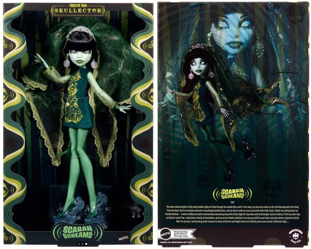 Сегодня, 13 января 2026 года, для участников Fang Club официально открылся предзаказ самой обсуждаемой Skullector-коллекционки последнего времени - Scarah Screams. И да, она снова сделала это. Снова заставила всех разом потерять голову, открыть рты и начать параллельно писать в чатах «ЧТООООО ЭТО ТАКОЕЕЕ». Давайте посмотрим, чем именно Scarah в этот раз всех уделала. Главный наряд - глубокое бархатное мини-платье цвета ночного леса с очень характерной кельтской вышивкой. Но это не просто красивые узоры. Это башня.