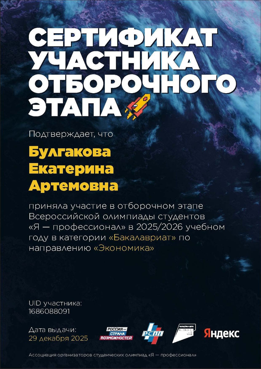 »! Булгакова Екатерина Артемовна стала финалистом престижной Всероссийской олимпиады студентов «Я — профессионал». 🚀 Екатерина успешно преодолела отборочный этап в категории «Бакалавриат» по направлению «Экономика». Олимпиада «Я — профессионал» — один из самых масштабных интеллектуальных конкурсов страны, и выход в финал подтверждает высочайший уровень профессиональных компетенций нашего студента, его лидерские качества и умение решать сложнейшие управленческие кейсы. Поздравляем Екатерину с этим достижением! Весь университет болеет за тебя в финале! Желаем удачи, уверенности и только победы! 🎓🇷🇺 #МИУ #ЯПрофессионал #Экономика #СтудентыМИУ