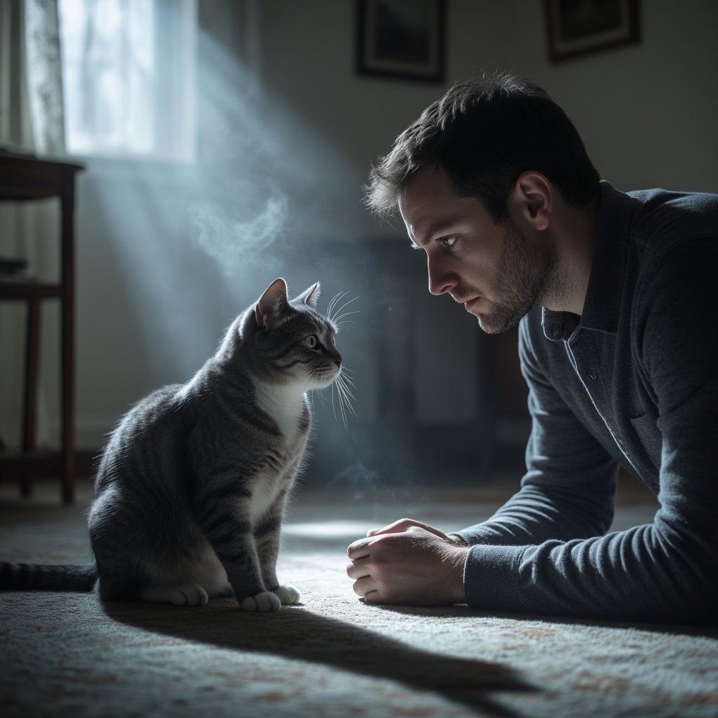 Его вывел из небытия влажный упор в щёку. Не толчок, а скорее вопрос. Серо-черный кот Эл, тот самый, с белыми лапками, будто наступившими в муку, и с белой грудкой, как в жилетке, вглядывалась в него жёлтыми глазами. Всё было на своих местах. Пыль на полках лежала не слоем, а памятью о времени. Стопки рукописей не читались, а молчали, как закрытые архивы. Пустые чашки на столе хранили отпечатки губ и следы давних разговоров.