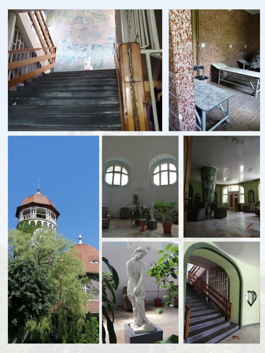 И примыкающий к ней корпус водогрязелечебницы. В водогрязелечебнице можно было принять тёплые морские и углекислые ванны, проводилось грязевое, электрическое, световое лечение и лечебный массаж. В верхней части водонапорной башни под шлемовидной крышей была устроена смотровая площадка, с которой открывался вид на море.