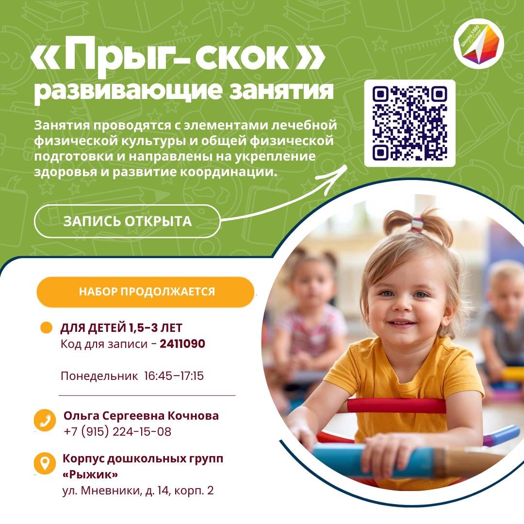 В нашей школе №1560 «Лидер» 🏫📚🎓 реализуется программа объединения дополнительного образования «Прыг-скок» для детей от 1,5 до 3 лет. Занятия проводятся с элементами лечебной физической культуры и общей физической подготовки и направлены на укрепление здоровья, развитие координации, силы и ловкости. В игровой форме дети бегают, прыгают, танцуют под музыку, выполняют упражнения с мячами, обручами и мягкими модулями. Место проведения: корпус дошкольных групп «Рыжик» (ул. Мневники, д. 14, корп. 2) Расписание занятий: • Понедельник — 16:45–17:15 Код программы на mos.ru: 2411090 Педагог: Ольга Сергеевна Кочнова 📞 +7 (915) 224-15-08 📌 При возникновении дополнительных вопросов вы можете обратиться к куратору реализации программ дополнительного образования #Школа1560Лидер, Елене Анатольевне Деевой, по телефону: +7 (916) 371-64-95. Еще больше полезной информации — в нашем МАХ. #ДОНМ #НашУправляющийСовет