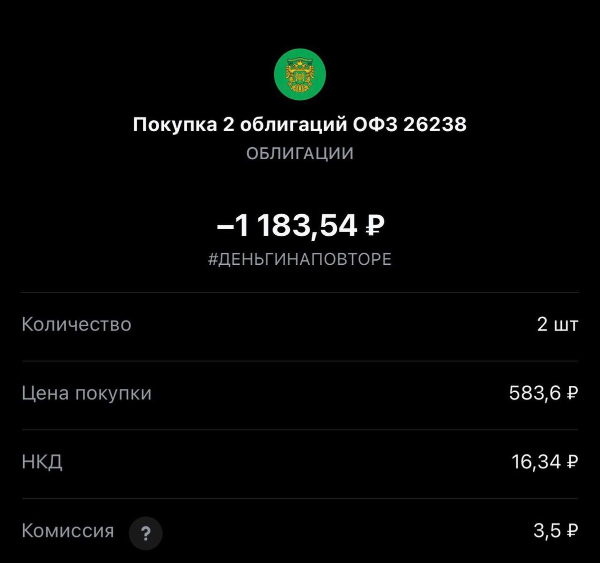 ! Сегодня покупка в стратегию #деньгинаповторе и пока у нас такой рынок, хочется покупать еще ОФЗ. Хотя многие уже просят сделки с акциями, будем чередовать. Не смотря на происходящее, жду продолжения цикла снижения ключевой ставки поэтому берем дальние облиги. 🟢 ПОКУПКА Эмитент: «ОФЗ 26238» Тикер: #SU26238RMFS4 Цена покупки: 583.6 rub 2 лота НКД: 16.34 rub 🔗 чат для общения "тут" ✈️ Стас Мироненко