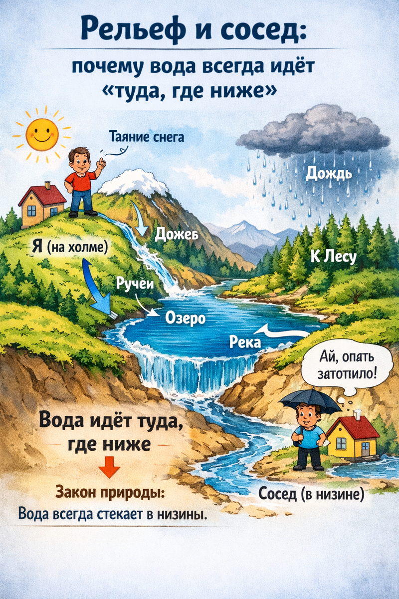 Вы подняли участок, завезли грунт, выровняли двор — красота. А через первый же ливень сосед приходит с простым вопросом: “Это теперь ко мне всё льётся?” И тут начинается классическая война за сантиметры, где каждый уверен, что прав. Физика, к сожалению, не выбирает сторону: вода действительно идёт туда, где ниже, и если Вы изменили рельеф — Вы изменили чужую жизнь тоже. 🌧️ Почему конфликт начинается “вдруг”, хотя дождь был всегда