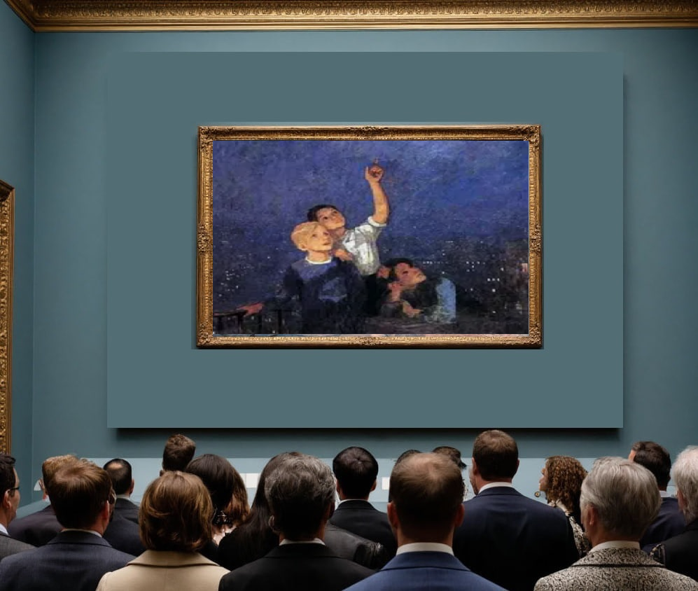 На полотне Фёдора Павловича Решетникова «Мальчишки» (1971) запечатлён момент искренней детской увлечённости и мечты о неизведанном. Трое друзей летней ночью забрались на крышу многоэтажного дома, чтобы оказаться ближе к звёздному небу, которое манит их своей таинственностью. Художник мастерски передаёт атмосферу советской эпохи, когда каждый школьник грезил о космосе и далёких планетах. Главные герои картины расположены так, что образуют круг, подчёркивающий их единство и общность интересов. Мальчик слева, охваченный восторгом, устремил взор ввысь; его глаза светятся голубым огнём, отражая бесконечность небосвода. Центральный персонаж увлечённо рассказывает друзьям о чём-то важном, указывая пальцем в небо, а третий товарищ внимательно слушает, подперев голову рукой, погружённый в глубокие раздумья. Цветовая гамма произведения построена на контрасте тёмного ночного неба и освещённых лиц мальчиков, на которые падает загадочный свет. На заднем плане едва различимы огни спящего города,
