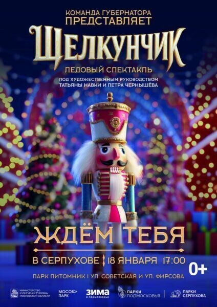 «В рамках проекта Губернатора #ЗимавПодмосковье готовим для жителей округа большой новогодний подарок», — рассказал в своем телеграм-канале глава Серпухова Алексей Шимко. 18 января на Центральной ледовой арене в парке «Питомник» состоится ледовое шоу «Щелкунчик» — главная сказка зимы от звёзд фигурного катания Татьяны Навки и Петра Чернышева. Начало мероприятия в 17:00. Вход свободный.