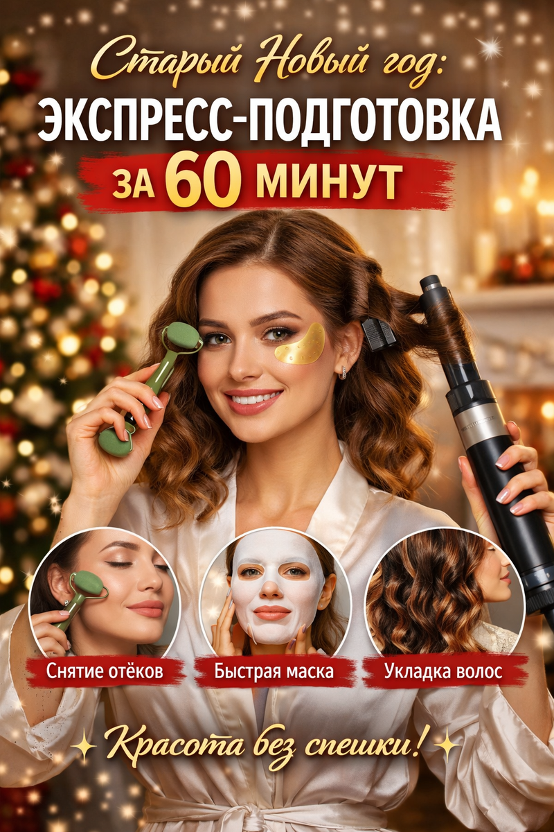 Гости уже в пути, а ты смотришь в зеркало и понимаешь: нужен режим “спасти праздник”. Хорошая новость — за 1 час можно освежить лицо, убрать отёки, быстро привести волосы в порядок и выглядеть так, будто ты готовилась весь день. Без салонов, без сложных процедур — только рабочие экспресс-методы, которые реально помогают. Сохраняй — пригодится не только на Старый Новый год 😉 Если лицо выглядит уставшим или «помятым» — это нормально после новогодних выходных. Наша задача — запустить лимфу и вернуть чёткость овалу. Как делать: 💡 Лайфхак: если нет массажёра — подойдут охлаждённые ложки из холодильника. Забудь про «подержать 40 минут». Нам нужны экспресс-формулы, которые работают сразу. Как усилить эффект: Результат: кожа гладкая, напитанная, макияж ложится идеально ✨ Мультистайлер — лучший друг, когда нет времени, но нужен эффект. Экспресс-алгоритм: ⏱ Время — 10–15 минут