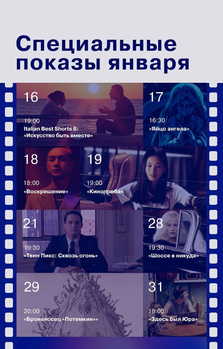 : 🍿16 января, 19:00 — Italian Best Shorts 8: «Искусство быть вместе» Короткие метры представит руководительница Итальянского центра культуры Сильвия Мандруццато; 🍿17 января, 16:30 — «Яйцо ангела» Спецпоказ аниме Мамору Осии представит кинокритик Ярославна Фролова; 🍿18 января, 18:00 — «Воскрешение» Премьеру фильма китайского режиссера Би Ганя представит и обсудит кинокритик, главный редактор сайта Okkoлокино Максим Ершов; 🍿19 января, 19:00 — «Кинопроба» Спецпоказ японского культового психологического триллера представит кинокритик и автор film.ru Константин Ямщинский; 🍿21 января, 19:30 — «Твин пикс: сквозь огонь» Спецпоказ предыстории Лоры Палрмер представит кинокритик и автор телеграм канала «с днем душнил!» Анна Логвинова; 🍿28 января, 19:30 — «Шоссе в никуда» Спецпоказ культового фильма Дэвида Линча представит теоретик кино и кинокуратор Ленфильма Юля Мурашова; 🍿29 января, 20:00 — «Броненосец Потемкин» Специальный показ к 100-летию фильма Сергея Эйзенштейна, спикер будет