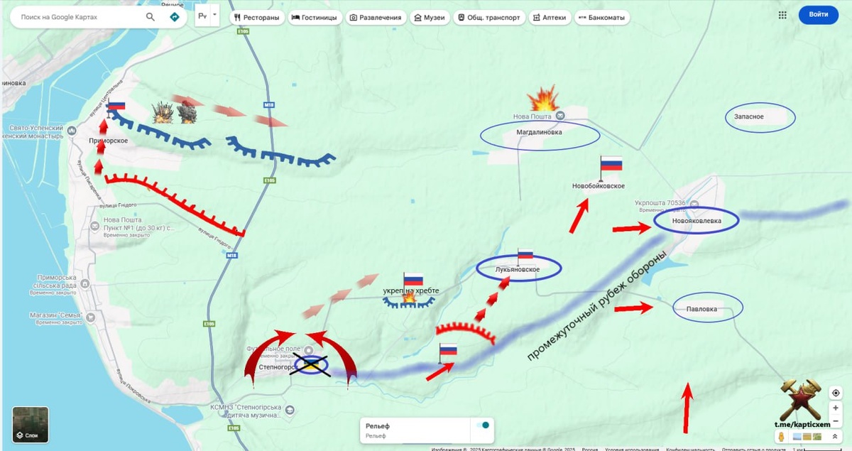 ВС РФ дочистили укрепления на хребте между Степногорском и Лукьяновское. Идет разведка подступов к Магдалиновке. Теперь и с юга подходят к Павловке. схемы и карты