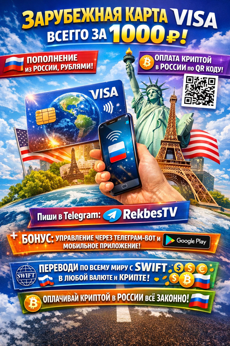 Сказка про золотую карточку, которая исполняет любые платежные желания Жили-были в современном мире ограничения и санкции, и не могли люди из России свободно платить за границей, пополнять счета привычным способом и наслаждаться покупками в Европе или США. Но вот однажды появилась волшебная возможность — акция на зарубежную карту Visa, которая всего за 1000 рублей открывает двери в мир безграничных платежей. По щучьему велению, по вашему хотенью — оформить карту можно прямо сейчас, не выходя из дома, и уже через короткое время пользоваться ею по полной. Представьте: вы пополняете карту рублями прямо из России, через удобные российские системы, а если хотите — оплачиваете криптой по QR-коду. Никаких сложных схем, никаких посредников — всё просто и быстро. А потом берёте телефон, прикладываете к терминалу и платите по NFC в США, в Европе или любой другой стране мира. Хотите подписаться на Netflix, купить билеты на концерт в Берлине или заказать технику из Америки — зарубежная Visa справ