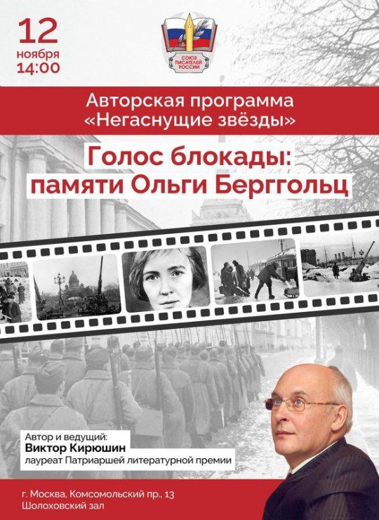В честь пятидесятилетия со дня смерти Ольги Берггольц лауреат Патриаршей литературной премии Виктор Кирюшин провёл программу «Негаснущие звёзды». На небольшой сцене, где стоял плакат с афишей вечера, инициатор вечера поведал гостям о биографии военной журналистки. Оказалось, что девушка имела совсем непростую жизнь. Её не раз исключали из Союза писателей России за чрезмерное освещение темы страдания в стихотворениях. Её обе дочери умерли в раннем возрасте. И почти каждый день оккупации в Ленинграде Ольга Берггольц выходила к микрофону. Несмотря на всю трагичность в стихотворениях, люди ждали каждого её эфира. В текстах журналистки они находили единство и надежду. В те времена, когда была дорога каждая крошка хлеба, столп надежды становился самой настоящей пищей для ума.