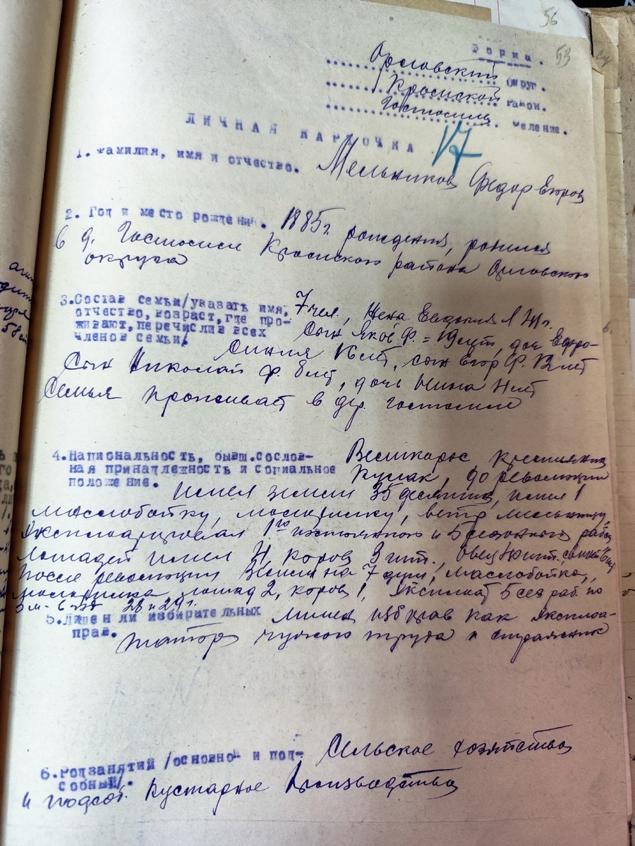 В другом списке за февраль 1930 г. подлежавших высылке в северный край присутствуют 30 хозяйств. Всего 165 человек от 2 месяцев до 78 лет. Социальный портрет выселяемых определяется на основании данных из составленных на них личных карточках. В этих документах присутствует такая информация, как: фамилия, имя, отчество, год и место рождения, состав семьи, национальность, бывшая сословная принадлежность и социальное положение, факт лишения избирательных прав, род занятий, служба в старой и красной армиях, в каких частях, в каком чине и в какое время, есть ли члены семьи, служащие в Красной армии (кто и где), подвергался ли суду и административным взысканиям (подробно где, за что, какой приговор и отбыл ли наказание). Дополнительная характеристика (сущность постановления батрацко-бедняцкого актива).
