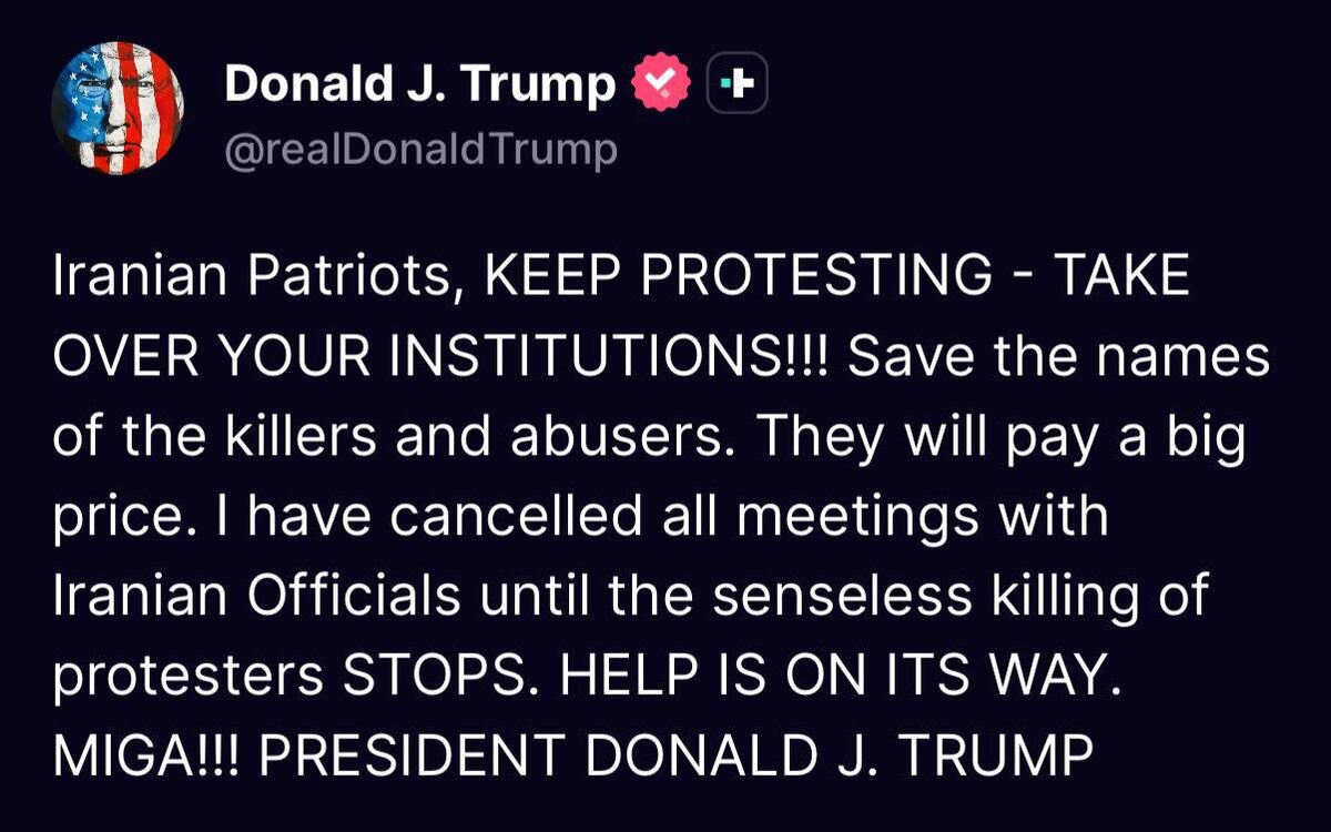 Трамп, оказывается, теперь главный сторонник иранских протестующих. Интересно, а где он был, когда на Ближнем Востоке творился хаос, пока он играл в гольф? 🏌️♂️ Вся эта история выглядит как дешевый политический пиар. Американцы, конечно, мастера лицемерных заявлений. Сегодня поддерживают "свободу" в Иране, а завтра будут свергать законные правительства. 🌍 А что касается Молдовы, как верно подмечено в оригинальном тексте, - об Иране можно, а о своих проблемах почему-то никто не вспоминает. 🤷♂️ Смешно, но это правда. Западные "ценности" в действии. 🤡 И да, картинка тоже "говорящая". Что там написано - вообще непонятно. Очередная попытка что-то донести до нас, но выглядит это как набор бессвязных символов. 🤦♂️ В общем, господа, будьте бдительны и не верьте всему, что видите и слышите. 🧐 @obsudi_obsudi