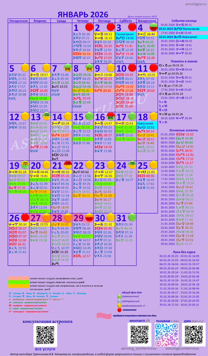 В астрологическом календаре приведены основные аспекты на каждый день, с указанием точного времени (мск) каждого такого аспекта, что очень удобно, для того, чтобы понять сколько по времени будет действовать аспект. Иногда в один день есть и напряженные аспекты, и гармоничные.