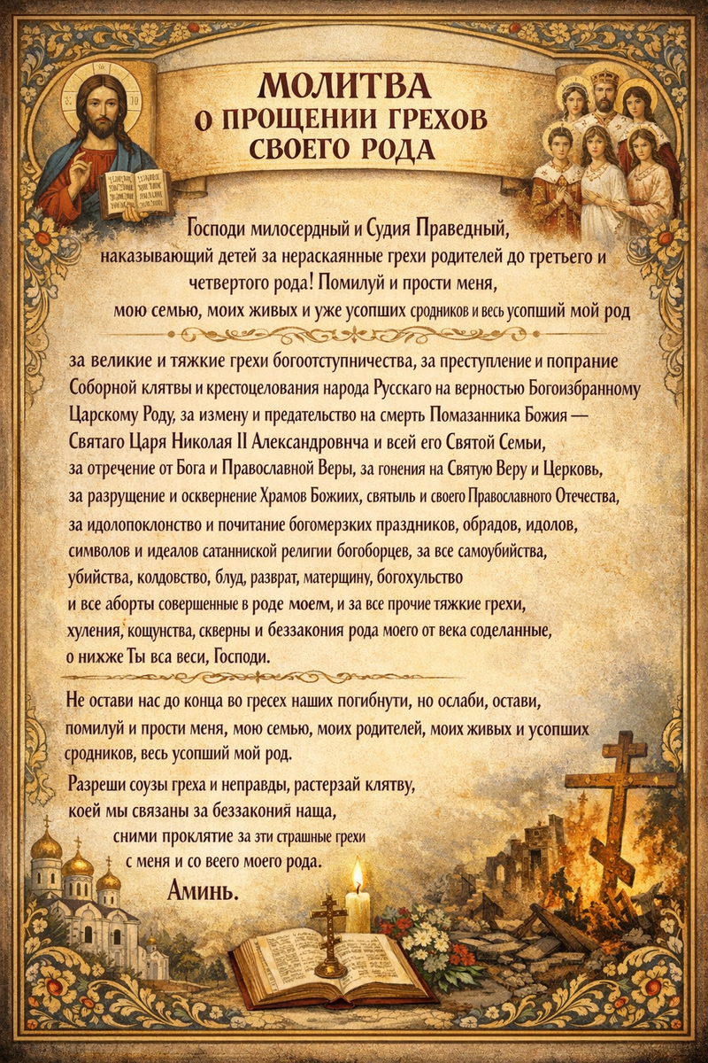 В интернете вы можете встретить вот такой вариант молитвы о прощении грехов за свой род. Православная Церковь никогда не учила о «родовых проклятиях» в оккультном или кармическом смысле. Грех не передаётся по наследству как вина, но последствия греховной жизни действительно формируют среду, в которой возрастает человек. Это не мистика, а духовная реальность: привычки, страсти, искажённые формы любви и веры передаются через воспитание, пример, культуру семьи. Молитва за род — это не попытка «стереть прошлое» и не просьба снять некое юридическое наказание с потомков. Это покаянное предстояние перед Богом, в котором человек осознаёт: он не существует вне истории, вне семьи, вне цепи человеческих выборо