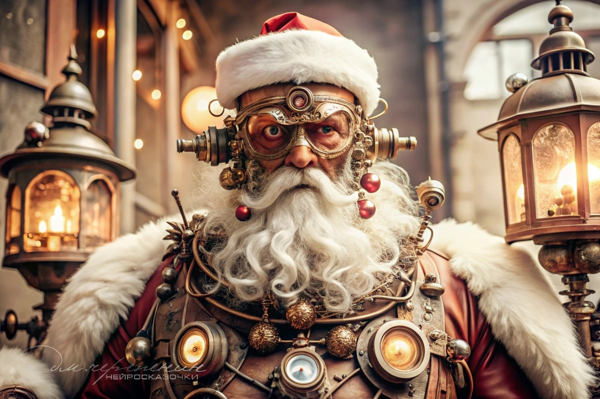Нью Лондон захлебнулся своим дыханием — маслянистым паром из стальных жабр рекуператоров. Над прокопчёнными каньонами Нижнего Города величаво парил аэростатный замок, где воздух фильтровали, а время считали шестерёнками. В своей медной келье старик Николас, Хранитель Времени, поправлял пружину Главного Хронографа. Его шлем с линзами и белой опушкой шипел. В отражении полированной меди он видел не праздник, а износ. Его красный воротник был знаком ранга, а не веселья. Хронограф показывал не только часы, но и «Общий ресурс». Стрелка ползла к нулю. Совет Парящих постановил: в полночь — «Территориальная коррекция». Испарители выпустят в нижние ярусы очищающий холод азота. Логично. Эффективно. Но под рёбрами, под кожей и шестерёнками, что-то тикало. Древнее, чем пар. Он сбросил ткань с личного механизма — точной модели города. Лампочки верхних ярусов горели ровно. Нижние — мигали, как в агонии. Его руки, привыкшие чинить, начали ломать. Он разбирал свои линзы, перемещал кристаллы, перепаива