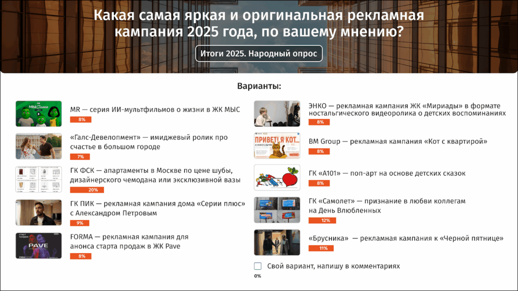 По мнению читателей портала Всеостройке.рф. Проект ГК ФСК удостоился звания лучшей рекламной кампании 2025 года по итогам народного голосования на портале Всeостройка.pф. Ключом к победе стала смелая концепция, сравнивающая стоимость московских апартаментов с ценой предметов роскоши — дизайнерской сумки, эксклюзивной вазы или элитной шубы. Именно этот креативный подход убедил 20% участников опроса отдать свои голоса застройщику. Масштабное народное голосование проходило с 17 декабря 2025 по 13 января 2026 года. Его участникам предлагалось выбрать победителей в четырех категориях, одна из них — «Самая яркая и оригинальная рекламная кампания 2025 года». Для обеспечения чистоты и прозрачности процесса все голоса логировались и были защищены от ботов с помощью Yandex SmartCaptcha, а также проверкой на запрет повторных голосов с одного ip-адреса. Согласно результатам, большинство участников опроса — 20% — отдали свои голоса за рекламную кампанию ГК ФСК. Застройщик привлек внимание аудитории