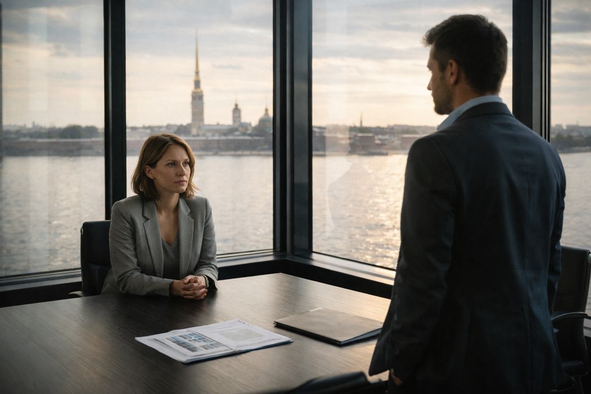 Комната была просторной: длинный стол, кресла, панорамные окна во всю стену. За окном — Нева, солнце на воде, вдалеке шпиль Петропавловки.