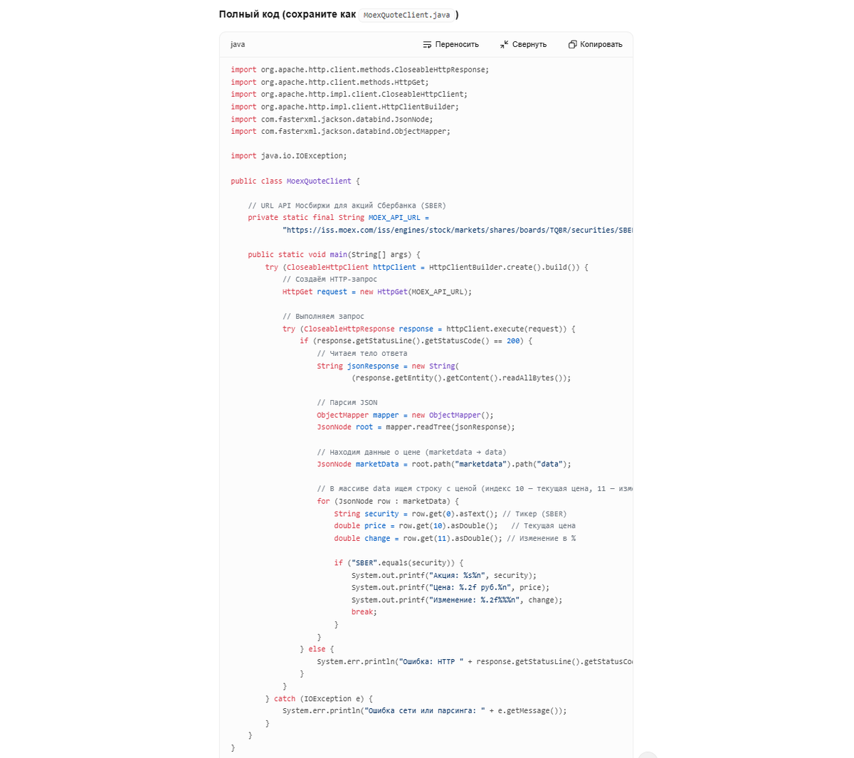 Короче, мучал я ее мучал. Пока наконец с сотой попытки у меня не получилось отладить эту программульку, и она мне выдала котировку того самого Сбера.