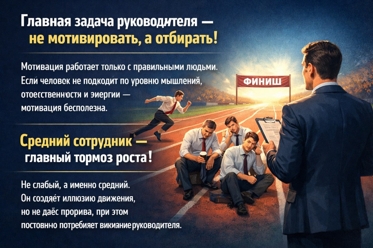 Мотивация работает только с правильными людьми. Если человек не подходит по уровню мышления, ответственности и энергии — мотивация бесполезна. Средний сотрудник — главный тормоз роста. Не слабый, а именно средний. Он создаёт иллюзию движения, но не даёт прорыва, при этом постоянно потребляет внимание руководителя.