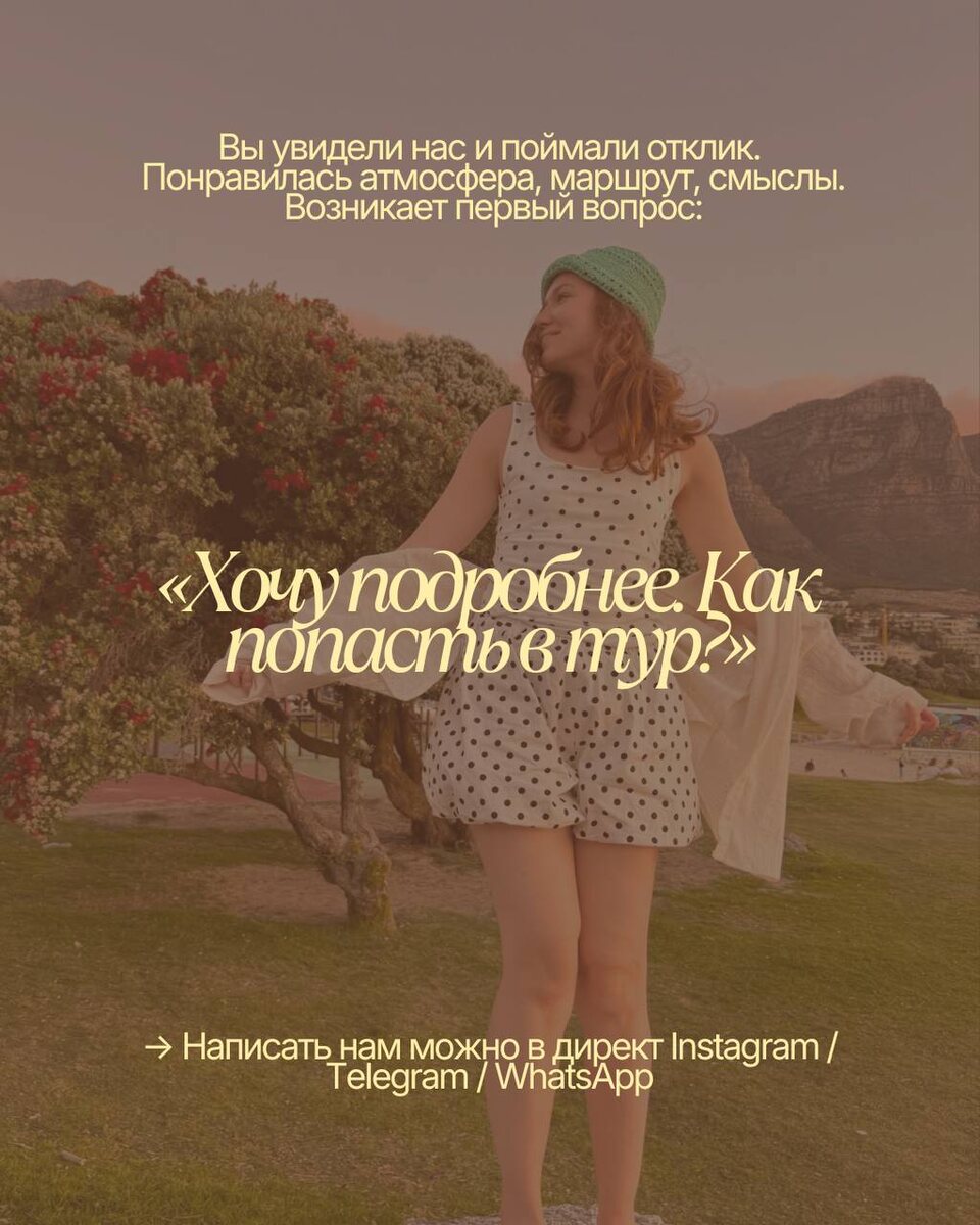 ? В посте мы подробно рассказали, как с нами связаться и забронировать тур — выбирай удобный способ и пиши🩷 Даже если ты пока только присматриваешься и не до конца определилась, всё равно смело пиши нам. Расскажем подробнее, ответим на вопросы и поможем подобрать тур именно под тебя. И напоминаем: у нас действует внутренняя рассрочка, чтобы путешествие было ещё доступнее