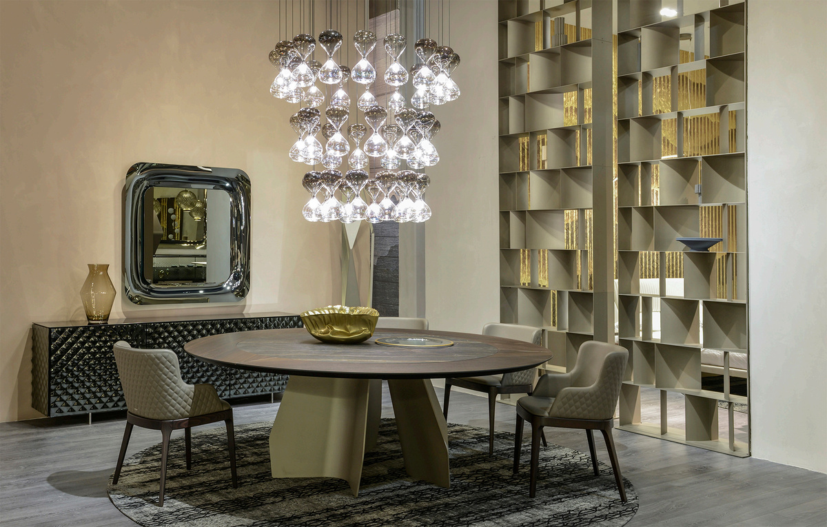 Центром композиции становится круглый стол Senator Ker-Wood с эффектной столешницей, и подстольем в отделке titanium. Стулья Magda Couture в коже оттенка castoro с основанием выполненного из массива дерева. Открытый стеллаж Nautilus в титатовой отделке, визуально соединяет пространство. Тонированное зеркало Glenn, комод Vivaldi B3 с фасадами из стекла fumé и подвесные светильники Sablier с градиентным стеклом вносят сложные, благородные акценты. Композицию завершает круглый ковёр Mumbai. Фабрика: Cattelan Italia