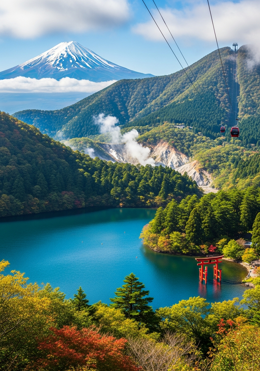 Древний синтоистский храм, скрытый в роще гигантских криптомерий на берегу озера Аси. Знаменитые алые ворота тории, стоящие прямо в воде озера, стали визитной карточкой Хаконе — это место, где природа и духовность переплетаются в единое целое.