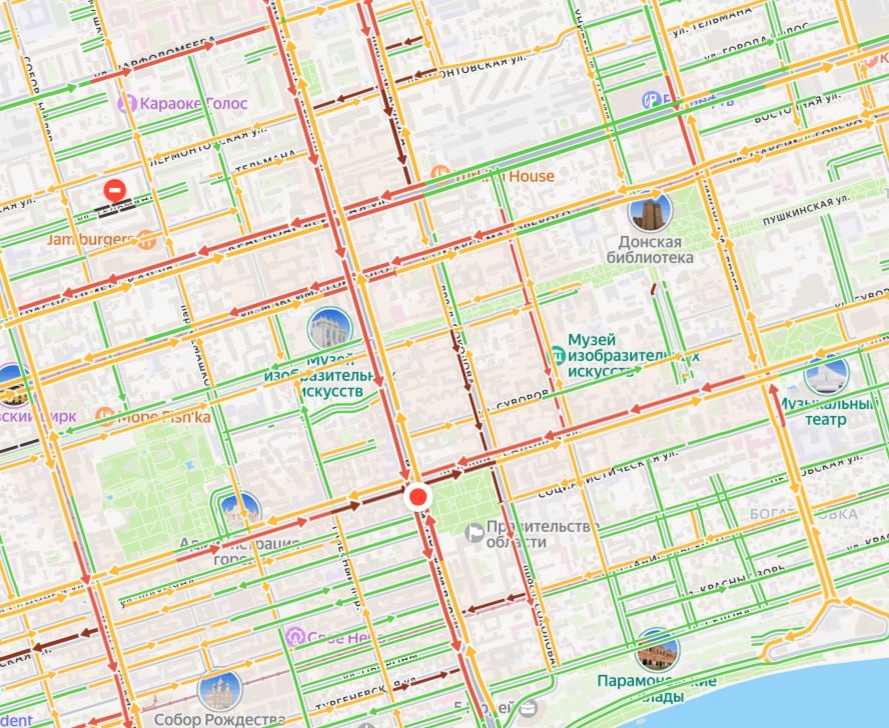 Сейчас стоит весь центр: Красноармейская, Большая Садовая, Ворошиловский Буденновский, Нансена, Береговая, ЦГБ и прочее. Ситуацию усложняют несколько ДТП.