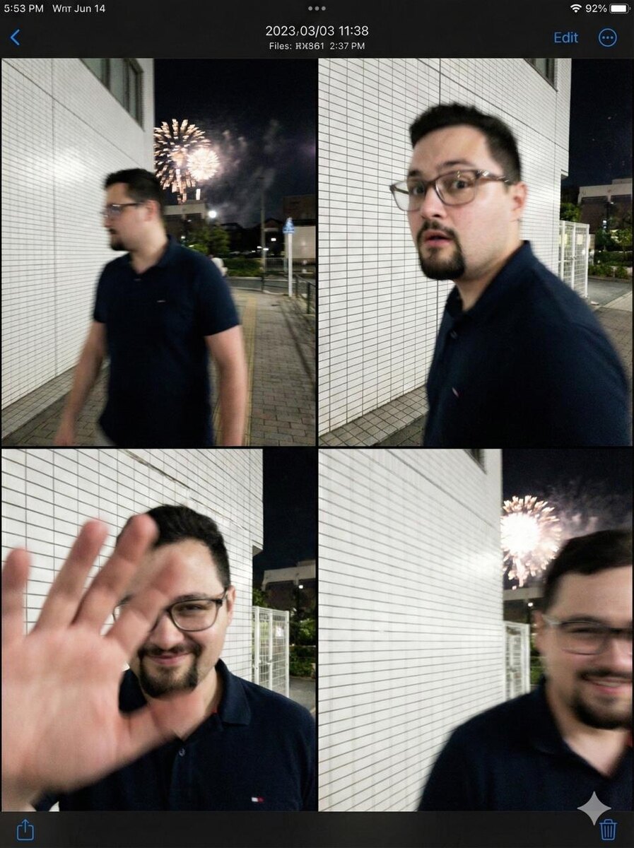 ▫️▫️▫️▫️▫️▫️ ▫️▫️▫️▫️▫️. ▫️▫️▫️ - реально олдскульная тема 💡 💡 💡 💡 💡 💡 💡 💡 💡 💡 💡 💡 Делаем 2×2 коллаж из четырёх «случайных» фото в Nano Banana Pro. Этот промт позволяет создать эффект спешной съёмки на телефон: со вспышкой, промахом автофокуса, сильной тряской, смазом движения и двоением контуров. В качестве исходника загружаем селфи и просто копируем/вставляем промт: Ultra-realistic accidental smartphone photo — quad-frame contact sheet. Single image, 2×2 grid of four vertical 9:16 frames, rushed handheld burst. Use uploaded selfie as ONLY face reference. Identity lock: exact likeness, facial geometry/proportions, natural skin texture. No beautification. Night Tokyo sidewalk by plain white ceramic tile building. Fireworks only as distant smeared light streaks / blown-out blobs (not centered). Modern smartphone failure: harsh flash, missed autofocus, extreme shake, heavy motion blur, ghosting/double edges, clipped highlights, uneven exposure, strong noise. Nothing sha