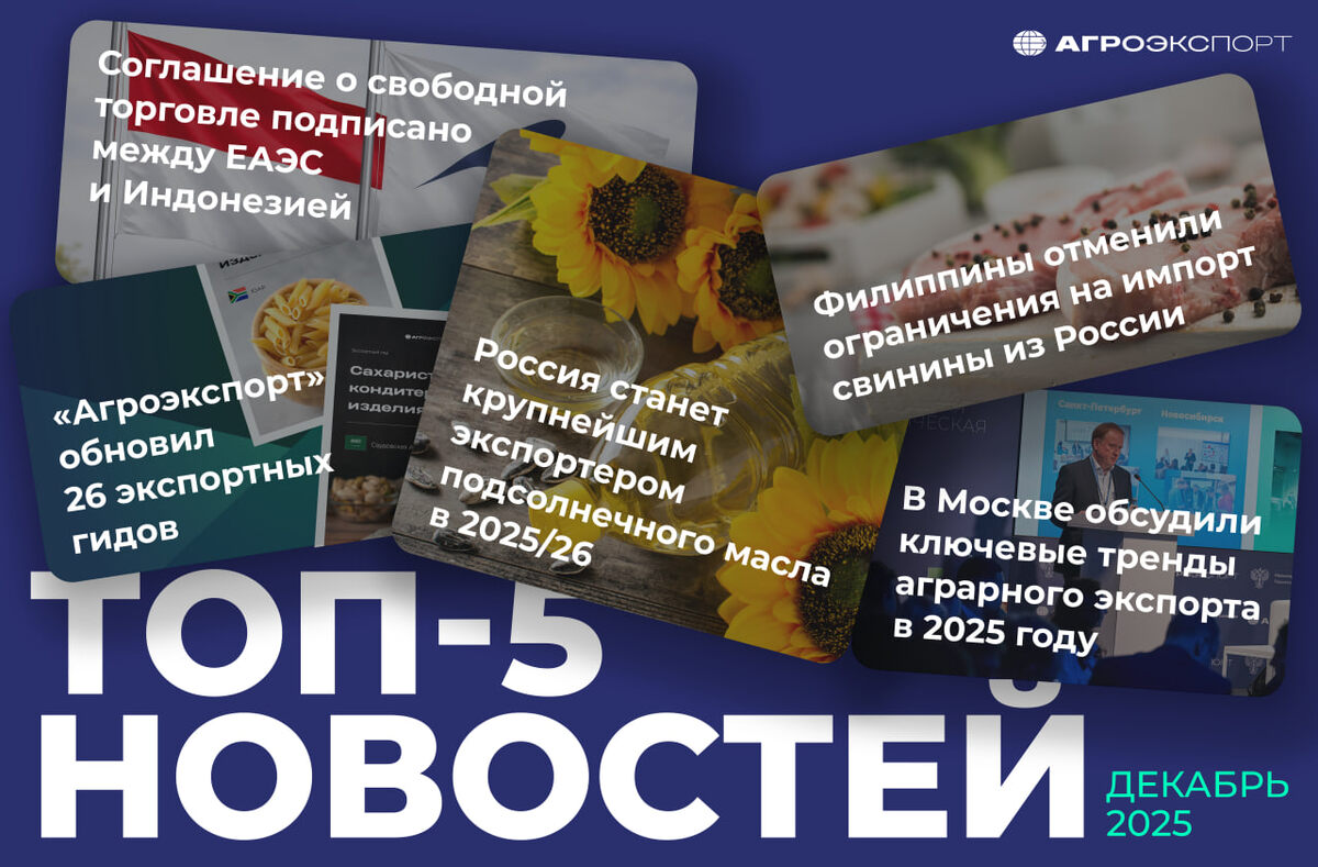 ✅ В Москве обсудили ключевые тренды аграрного экспорта в 2025 году. Агроэкспорт 🤝 Соглашение о свободной торговле подписано между ЕАЭС и Индонезией. Евразийская экономическая комиссия 🐖 Филиппины отменили ограничения на импорт свинины из России. Россельхознадзор 📊 Россия станет крупнейшим экспортером подсолнечного масла в 2025/26. USDA ✅ «Агроэкспорт» обновил 26 экспортных гидов. Агроэкспорт