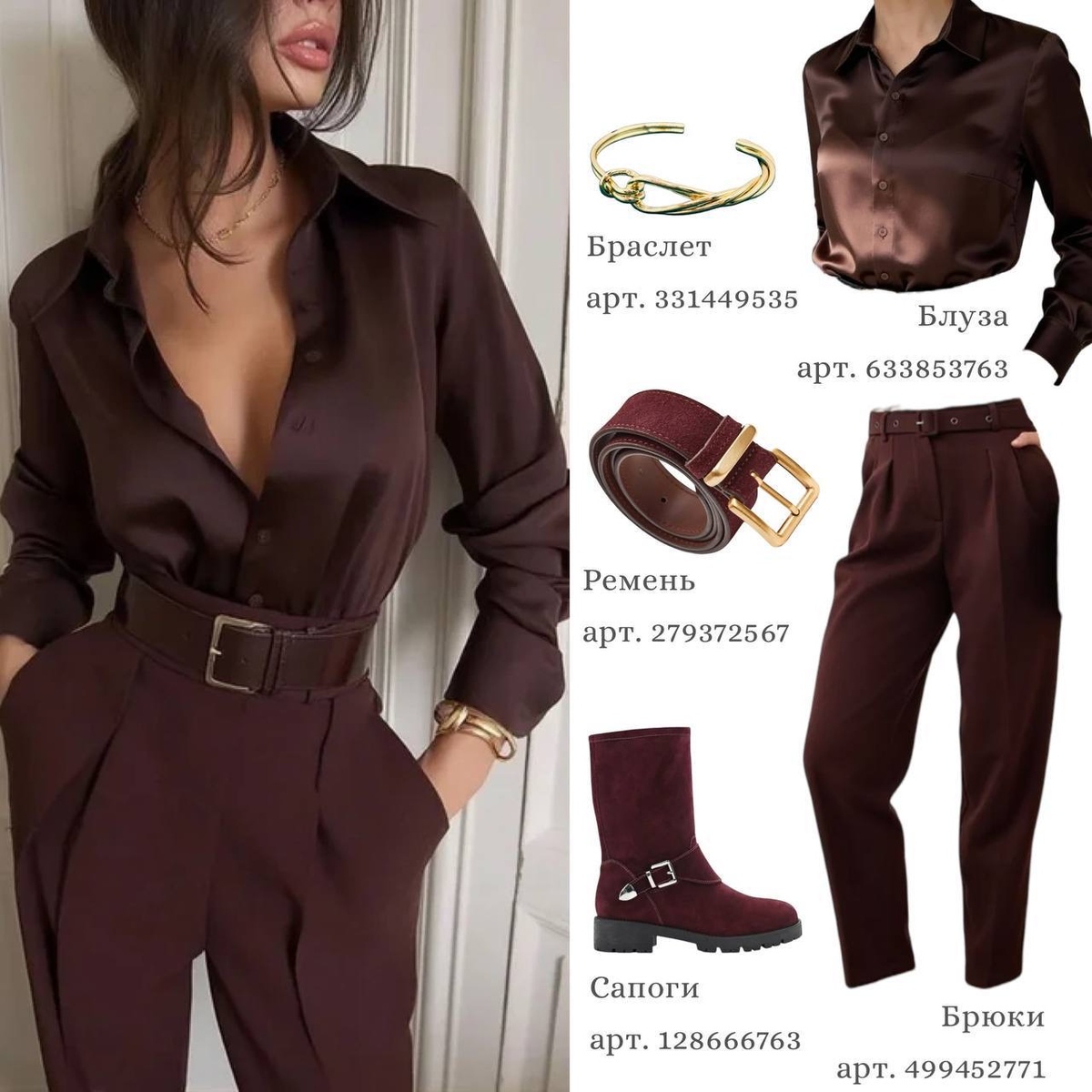 Глубокие коричневые оттенки всегда выглядят благородно и очень женственно. Сочетание струящейся блузы с мягким блеском и классических брюк создаёт эффект собранного, но при этом чувственного образа. Акцент на талии с помощью ремня подчёркивает силуэт, а лаконичные украшения добавляют завершённости.