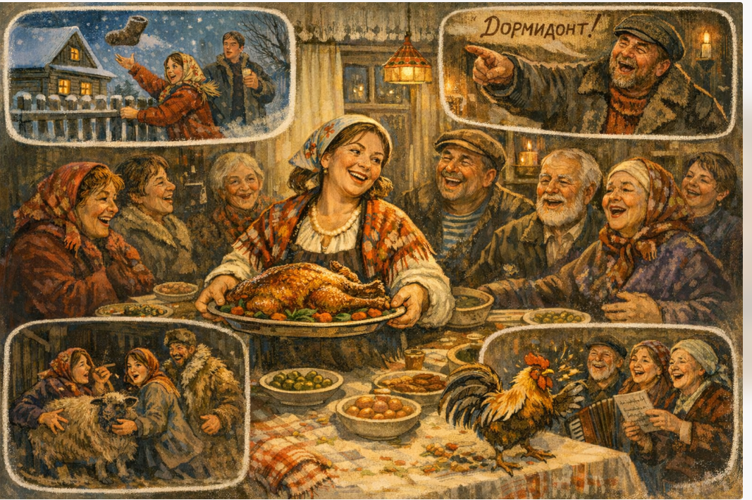 Хозяйка несёт пышущего жаром гуся, гости суетятся, наливают, говорят тосты...