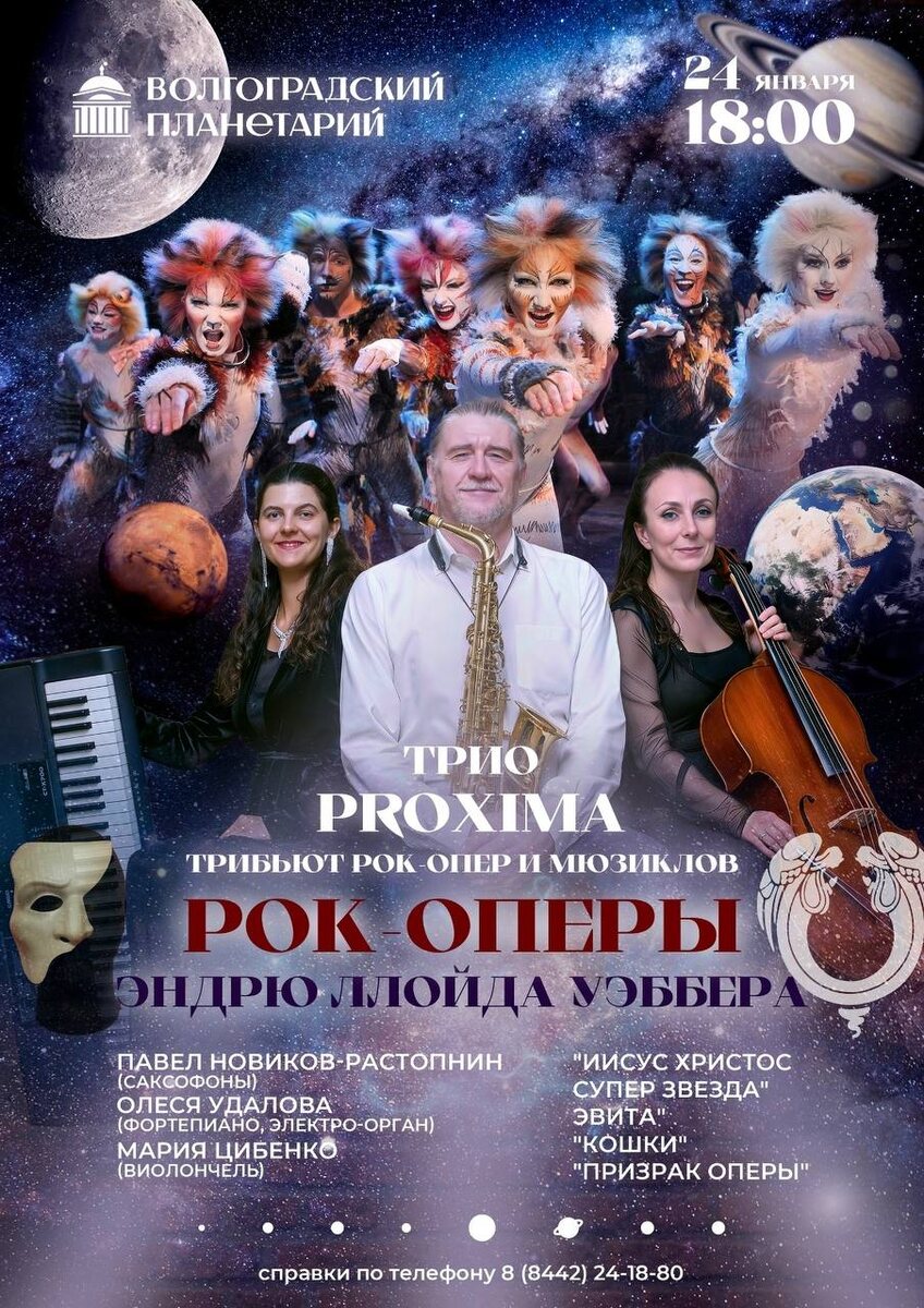 .......................................... ТРИБЬЮТ РОК-ОПЕР И МЮЗИКЛОВ Эндрю Ллойда Уэббера #Концерт_В_планетарии .......................................... ⠀ ⠀ 🔥 24 января в 18:00 под куполом зала развернётся яркое музыкальное путешествие по миру великих рок-опер и мюзиклов. Зрителей ждет живое звучание саксофона, фортепиано, электрооргана и виолончели, а также полное погружение. ⠀ На одной сцене встретятся мелодии рок-оперы "Иисус Христос — суперзвезда", мюзиклов "Кошки", "Эвита", "Призрак Оперы", "Иосиф и его удивительный разноцветный плащ снов" — тех самых спектаклей, которые сделали имя Эндрю Ллойда Уэббера символом мирового музыкального театра. ⠀ ⠀ В программе прозвучат любимые темы, покорившие зрителей по всему миру: ⚡ Memory, ⚡ Don’t Cry for Me Argentina, ⚡ The Music of the Night, Think of Me и увертюра из "Призрака Оперы", ⚡ I Don’t Know How to Love Him, ⚡ Pilate’s Dream, ⚡ The Last Supper, ⚡ Everything’s Alright, ⚡ Superstar из "Иисус Христос — суперзвезда". ⠀ ⠀ Музыку Уэб