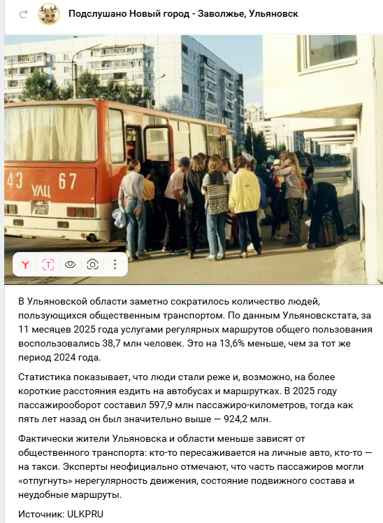 В ульяновских СМИ появилась такая новость: Полный бред. Я сама активный пользователь общественного транспорта как внутри города, так и по межгороду. В день могу по три раза проехать в общественном транспорте. Скорее всего, статистика представлена по автобусам, трамваям и троллейбусам. Но тут всё понятно: пассажиры не пользуются данным видом общественного транспорта просто потому, что его нет. Реально на рейс один раз в час выходит один автобус или полуживой трамвай и пока он по всему маршруту пройдет, пассажиры уже состариться успеют. Быстрее доехать на маршрутке, чем дождаться автобус. По возможности, я конечно стараюсь пользоваться городским транспортом, а не частными маршрутками. Из-за цены. Проезд в маршрутке 43 рубля. А в автобусе, трамвае и троллейбусе 38 рублей при оплате наличными деньгами и 37 рублей при оплате картой. А у меня в семье три человека. Если взять по минимуму стоимость проезда 37 рублей по карте и, допустим, минимум каждый член семьи один раз в день воспольз