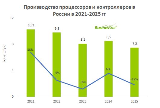 В 2025 г выпуск процессоров и контроллеров в России сократился на 12% в годовом выражении, составив 7,5 млн штук.