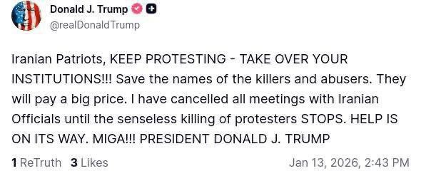 ! Дональд Трамп выступил с призывом к иранским протестующим захватывать органы власти и заявил, что поддержка со стороны США «уже в пути» В сообщении, опубликованном в его соцсети Truth Social, президент США обратился к участникам протестов, назвав их «иранскими патриотами». Он призвал их продолжать выступления, брать под контроль государственные структуры и фиксировать имена тех, кого он обвинил в убийствах и насилии. Трамп также сообщил, что отменил все встречи с представителями иранских властей до прекращения, по его словам, бессмысленных убийств протестующих. Ранее Reuters со ссылкой на анонимного иранского чиновника сообщало, что число погибших в ходе протестов превысило две тысячи человек. Власти Ирана, по данным источника, связывают гибель мирных жителей и сотрудников сил безопасности с действиями «террористических групп». ООН, опираясь на собственные источники, заявляет о сотнях погибших. Протесты в Иране продолжаются с 28 декабря. По информации правозащитных организаций, з