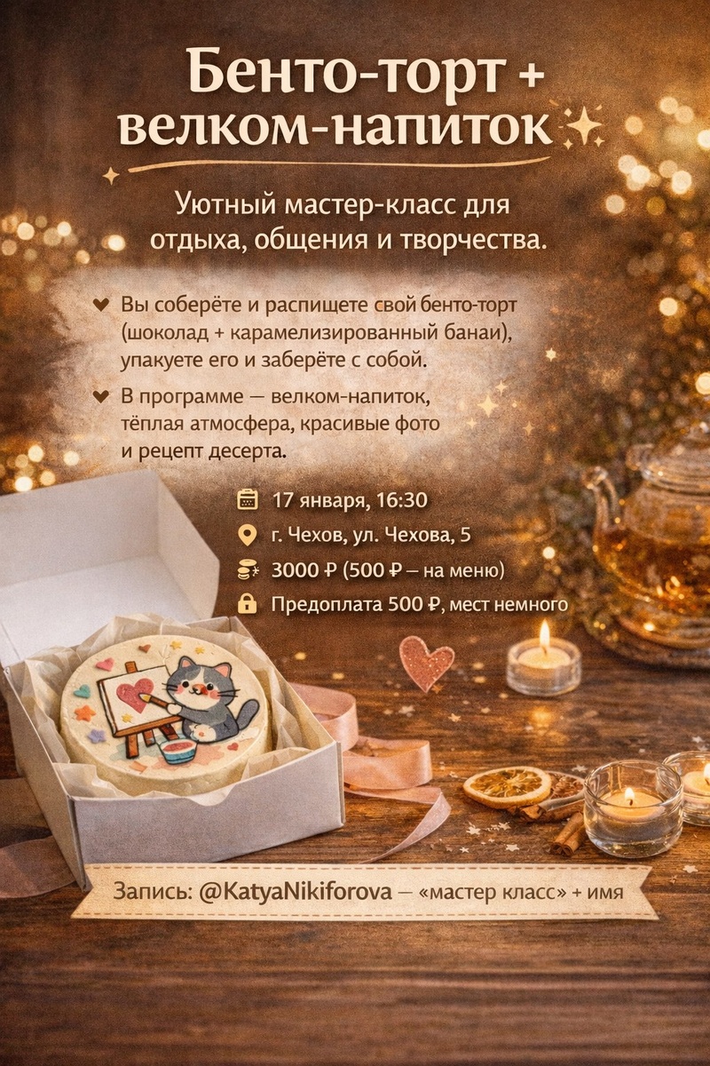 🍹 💗Уютный мастер-класс для отдыха, общения и творчества. 💫Вы соберёте и распишете свой бенто-торт (шоколад + карамелизированный банан), упакуете его и заберёте с собой. 📋 В программе — велком-напиток, тёплая атмосфера, красивые фото и рецепт десерта. 💰 3000 ₽ (500 ₽ — на меню) 🔒 Предоплата 500 ₽, мест немного. 🖋️Запись: https://t.me/KatyaNikiforova — «мастер класс» + имя. 🚫 Возраст: 14+ 📆 17.01.2026 🕛 16:30 🏢 Cloud Space 📍 г. Чехов, ул. Чехова, 5 💰 Цена: 3000 ₽ 🔗 Напишите нам: https://t.me/KatyaNikiforova ⭐Поддержать канал голосом #бентоторт #вкусныйвечер #мастерклассчехов #уютныйвыходной #творчествосовкусом ✅ Мероприятия Чехов https://dzen.ru/id/66cc4b48e9ef144699238a51 http://vk.com/chekhov_events http://dzen.ru/chekhov_events