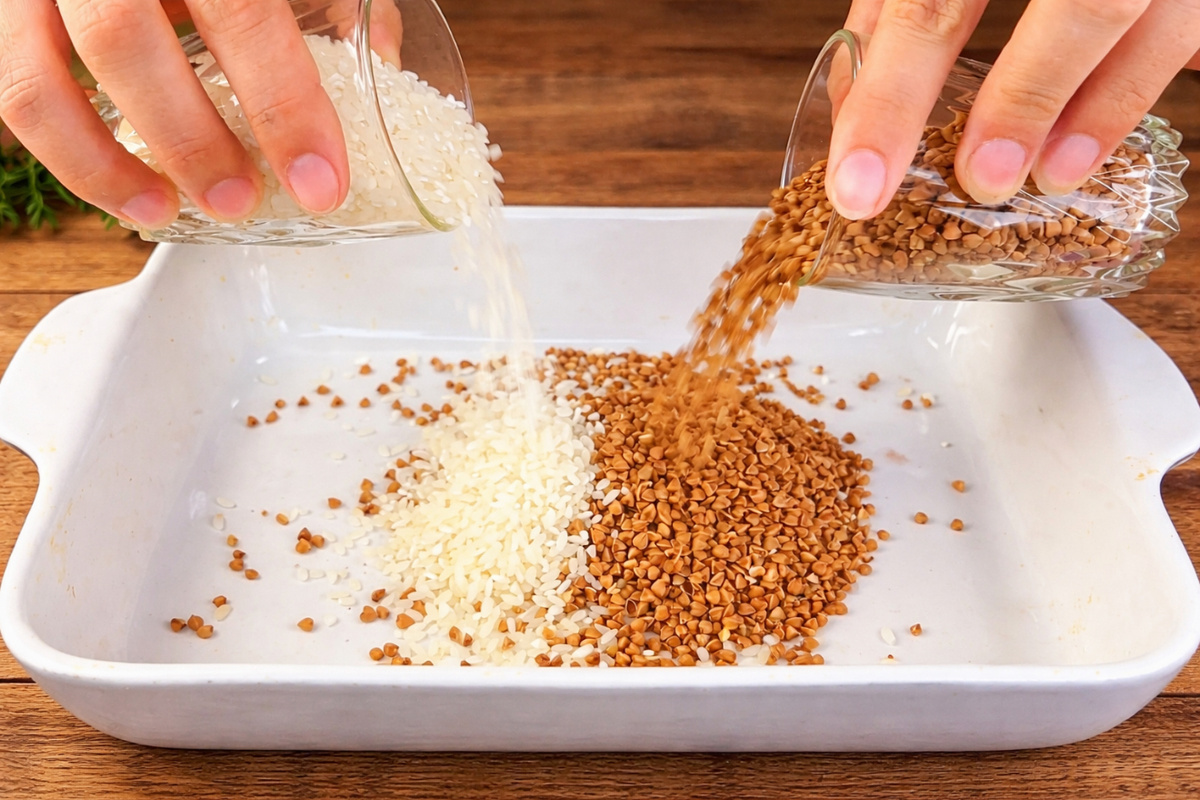 Секрет в необычном сочетании: рис + гречка. Вместе они дают насыщенный вкус и идеальную текстуру — рассыпчато, сытно и по-домашнему уютно.