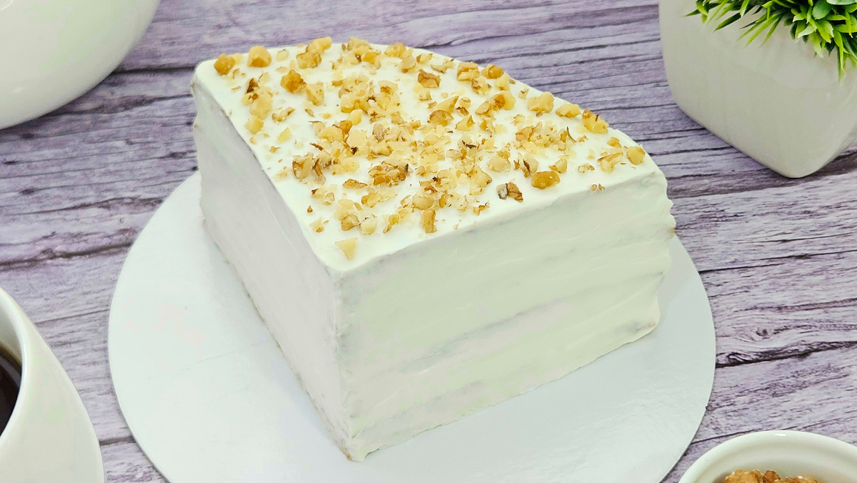 Обмазать верх и бока тортика кремом. Убрать в холодильник для пропитки и стабилизации на ночь. По желанию украсить грецкими орехами.