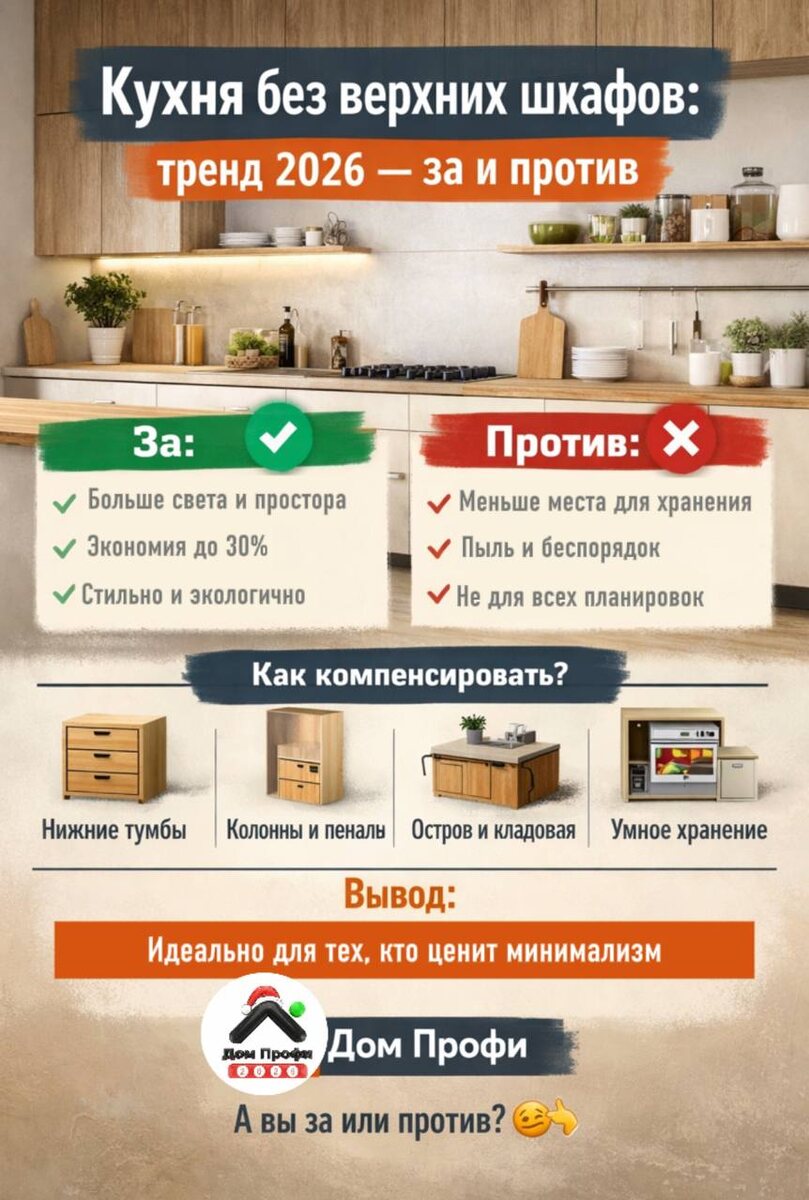 Кухня без верхних шкафов: за и против в 2026 году В 2026 году дизайн кухонь эволюционирует в сторону минимализма, экологичности и функциональности. Один из ярких трендов — отказ от верхних шкафов в пользу открытых пространств. Это решение не только визуально разгружает интерьер, но и меняет подход к хранению. Компания “Дом Профи” делится анализом преимуществ и недостатков такого подхода, основываясь на актуальных тенденциях. Если вы планируете ремонт, эта статья поможет взвесить все “за” и “против”. Почему это актуально в 2026 году? Согласно отчетам дизайнерских ассоциаций, кухни без верхних шкафов набирают популярность благодаря фокусу на натуральных материалах и умном хранении. В России и Европе этот тренд поддерживается ростом интереса к минимализму: открытые полки, глубокие нижние модули и колонны заменяют традиционные навесные конструкции. Такие кухни идеально вписываются в стили сканди, лофт и неоклассику, где акцент на свет и воздух. Вот пример современной кухни без верхних шк