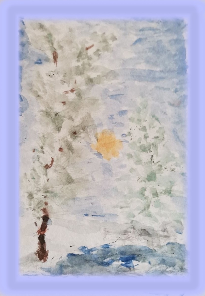 "Утро на Крещение" Медовая акварель, бумага, две жестких кисти. (Светлана написала эту работу, сидя за столом, в один сеанс). Размер 15х21см. Январь 2026 года. Автор работы – Светлана Курочкина художница, рукодельница, поэтесса, писательница и модератор сайта «Грани преодоления».