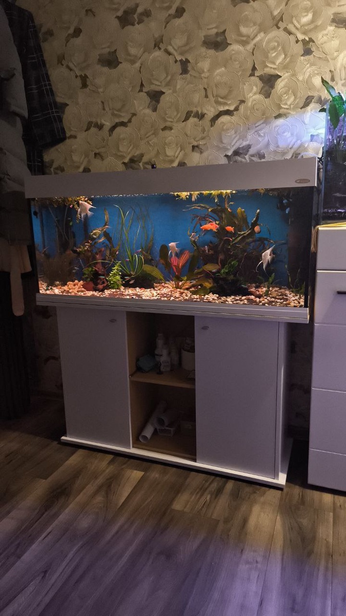 Ну вот запуск воды завершился. Вода чистая, прозрачная 😊. Обклеиваю аквариум и тумбу в белый цвет, осталось немного.