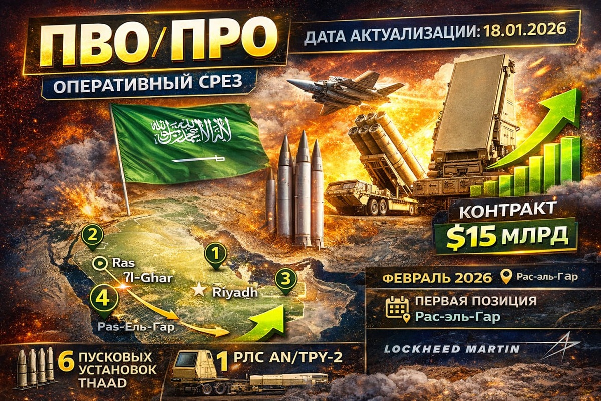 1️⃣ Ближний Восток 🇸🇦 Саудовская Аравия: минобороны КСА (08.01.2026) завершило обучение расчётов 4-й батареи THAAD и перешло к фазе развёртывания. Фактическая конфигурация на текущий момент: 6 ПУ THAAD, 1 РЛС AN/TPY-2. идёт строительство позиционных районов ▪️План развёртывания: февраль 2026 — первая позиция: Рас-эль-Гар (побережье Персидского залива) до конца 2026 — Янбу, Таиф, военный городок King Khalid 2027–апрель 2028 — Табук, Рас-Танаджиб, Эр-Рияд Стоимость: 15 млрд долларов США Запрос: 44 ПУ THAAD, 360 ракет, 16 мобильных КП, 7 РЛС AN/TPY-2 🔘Заодно интеграция с Patriot PAC-3 / Aegis / C2BMC ➡️ Фактически СА строит ПРО, ориентированную не только на Иран, но и на контроль всего Персидского залива. 🇶🇦 Катар: на авиабазе Аль-Удейд открыта (14.01.2026) новая структура: «Объединённая оперативная группа ПВО Ближнего Востока» США + представители 17 стран региона функция: координация ПВО/ПРО, обмен данными РЛС, раннее предупреждение ➡️ Формируется наднациональный контур управления,