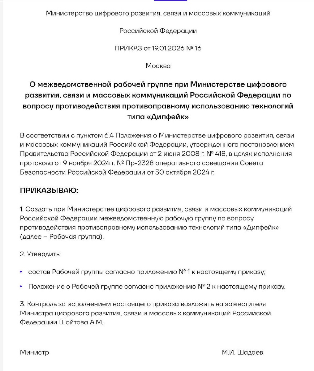 ⚡ Минцифры РФ создало группу для борьбы с противоправным использованием дипфейков
