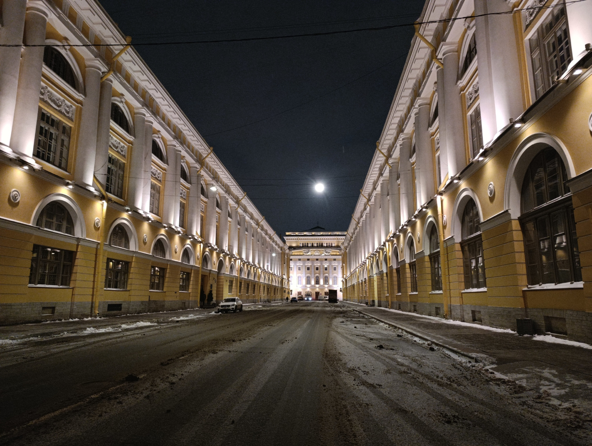 В предвкушении хорошего вечера, мы заранее направились в театр. Гостиница, где мы остановились, находилась в пяти минутах ходьбы, поэтому мы решили прогуляться. А это улица Зодчего России, которая ведет к театру с одной из сторон. Самая симметричная улица в городе, ширина улицы равна высоте зданий — 22 метра, а её длина ровно в десять раз больше — 220 метров.